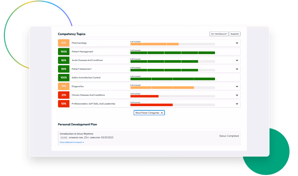 5,000+ specialty and setting-based assessment questions aligned with 8 competency groupings.