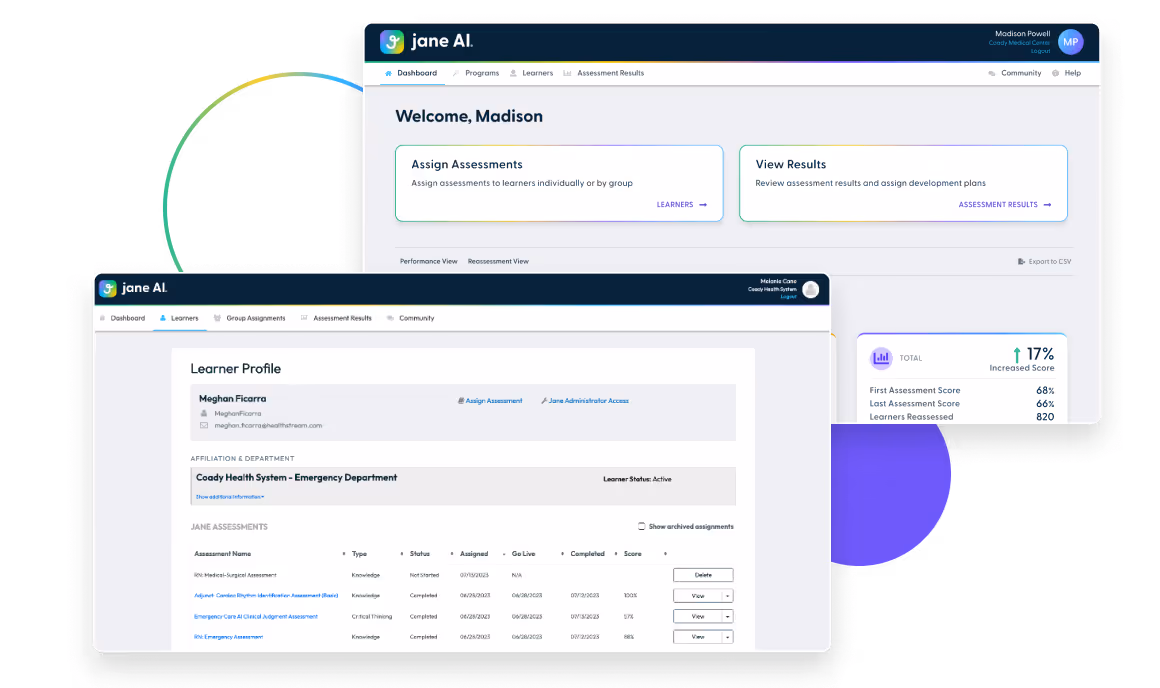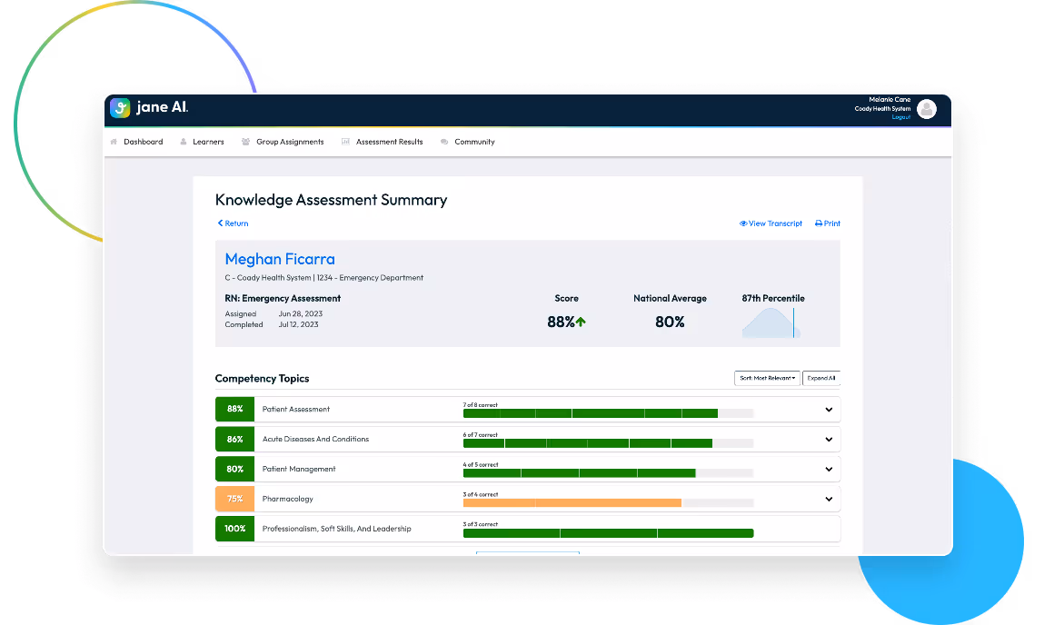 Following the completion of assessments, jane analyzes where there is opportunity for improvement, and curates a recommended learning plan to develop the individual based on gaps in knowledge and clinical judgment.